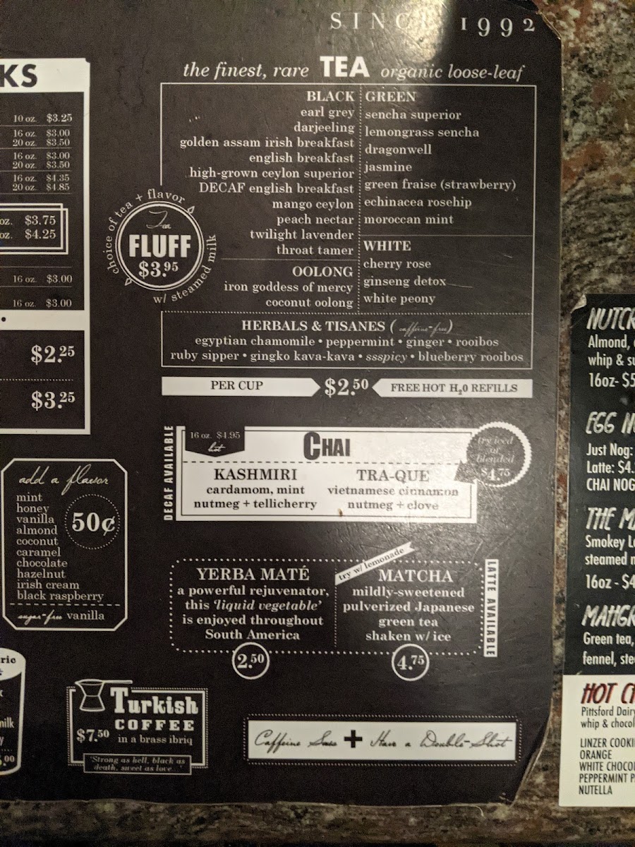 Java's Cafe in Rochester offers a thoughtfully crafted menu that centers on locally roasted coffee with rich, intense espresso options like the classic Americano and the frothy Cappuccino. Coffee lovers will also enjoy the unique Hot Cocaine, a daring blend of coffee and espresso. Their tea selection is equally impressive, featuring a range of green teas like Sencha Superior and Organic Jasmine, alongside soothing herbal blends such as Organic Egyptian Chamomile and Rooibos. While some longtime patrons miss the made-to-order chai, the cafe still delights with its well-rounded offerings, including tasty pastries like strawberry lemon tart and hearty oatmeal raisin cookies. The atmosphere is cozy and spacious, perfect for savoring a perfectly crafted mocha latte or a creamy Cafe Au Lait. Friendly baristas and a welcoming vibe add to the overall experience, making Java's Cafe a standout spot for both casual sips and work sessions.